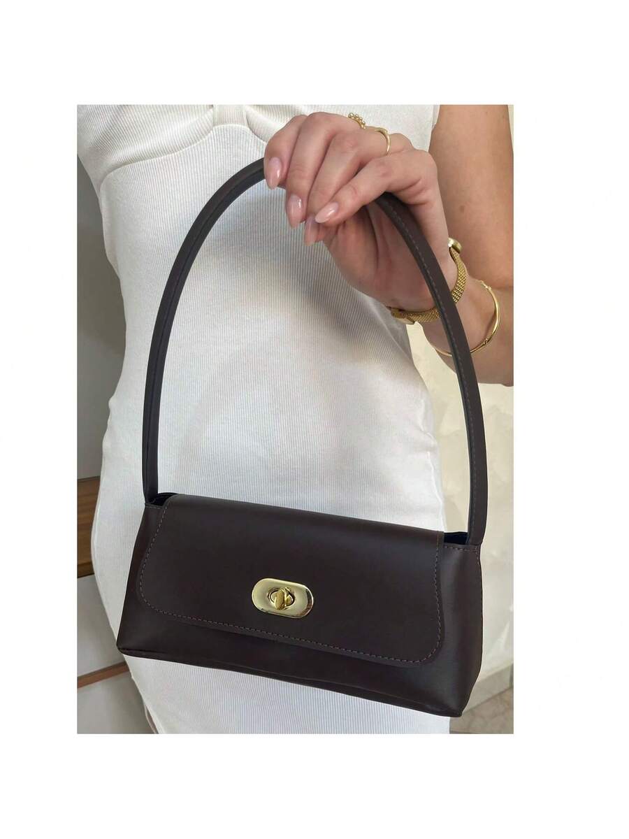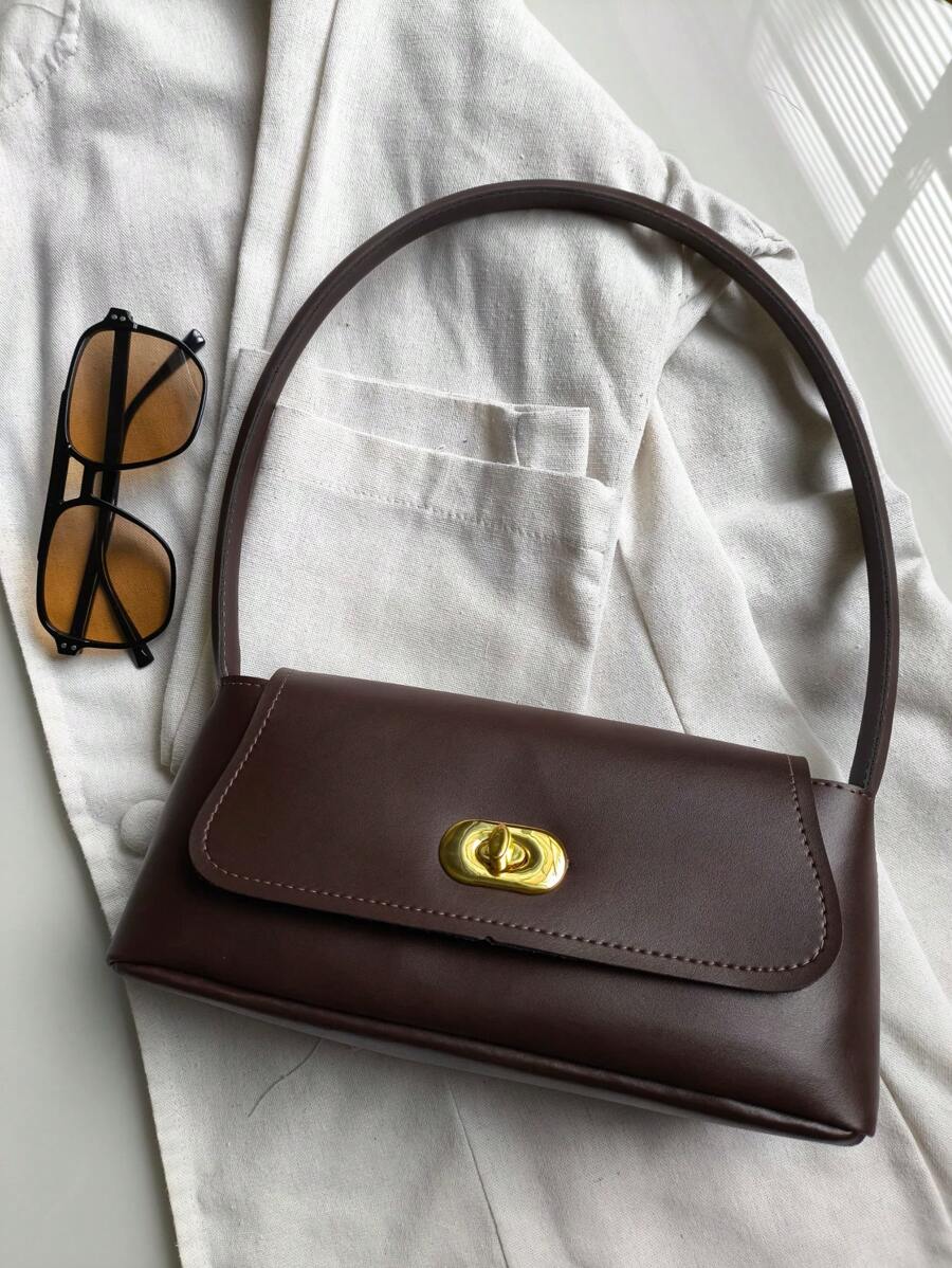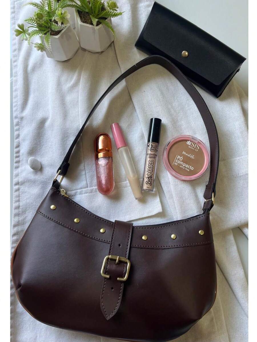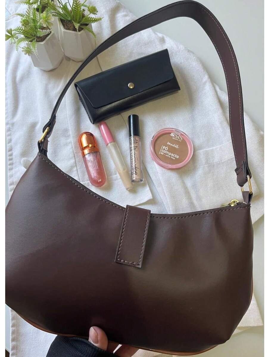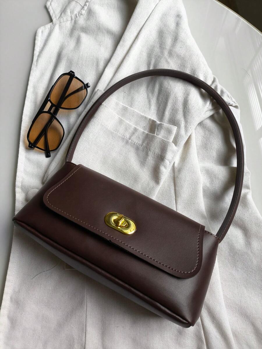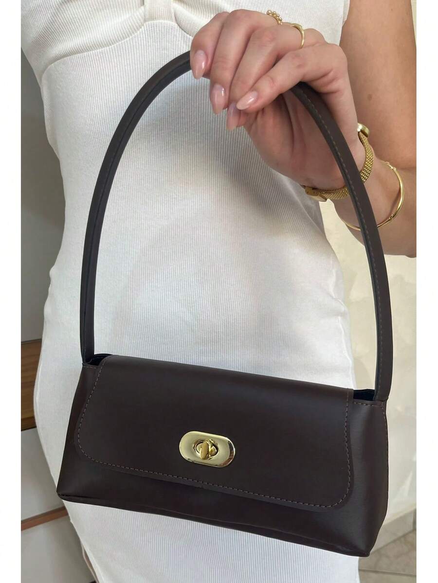 Bolsa Baguete Luxuosa Feminina Café com Fecho Dourado Giratório – Lançamento 1